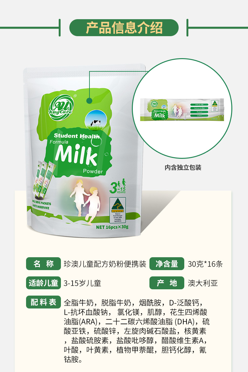澳大利亚进口 Au Kingcare 珍澳高钙速溶奶粉(便携袋装)480克