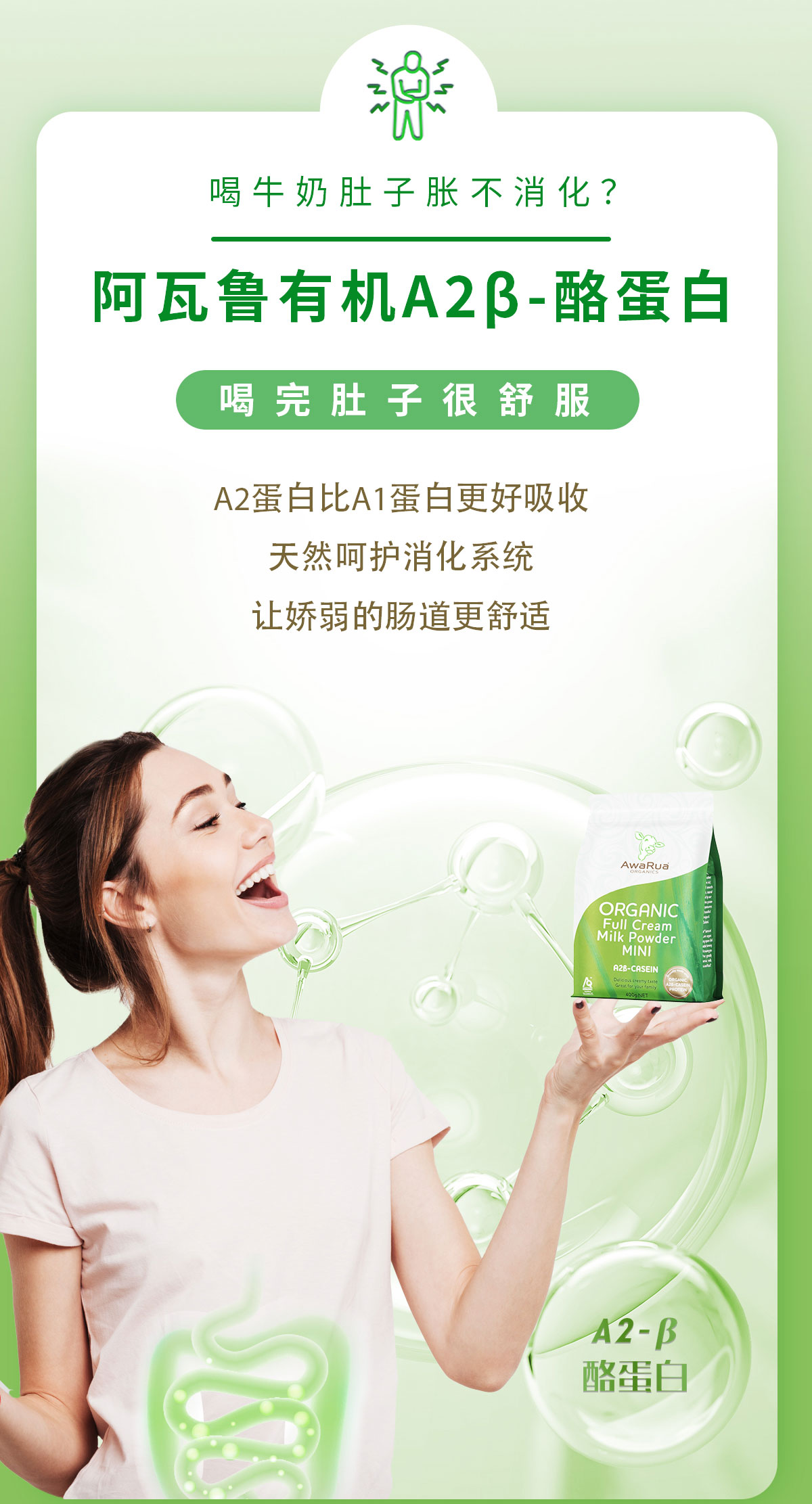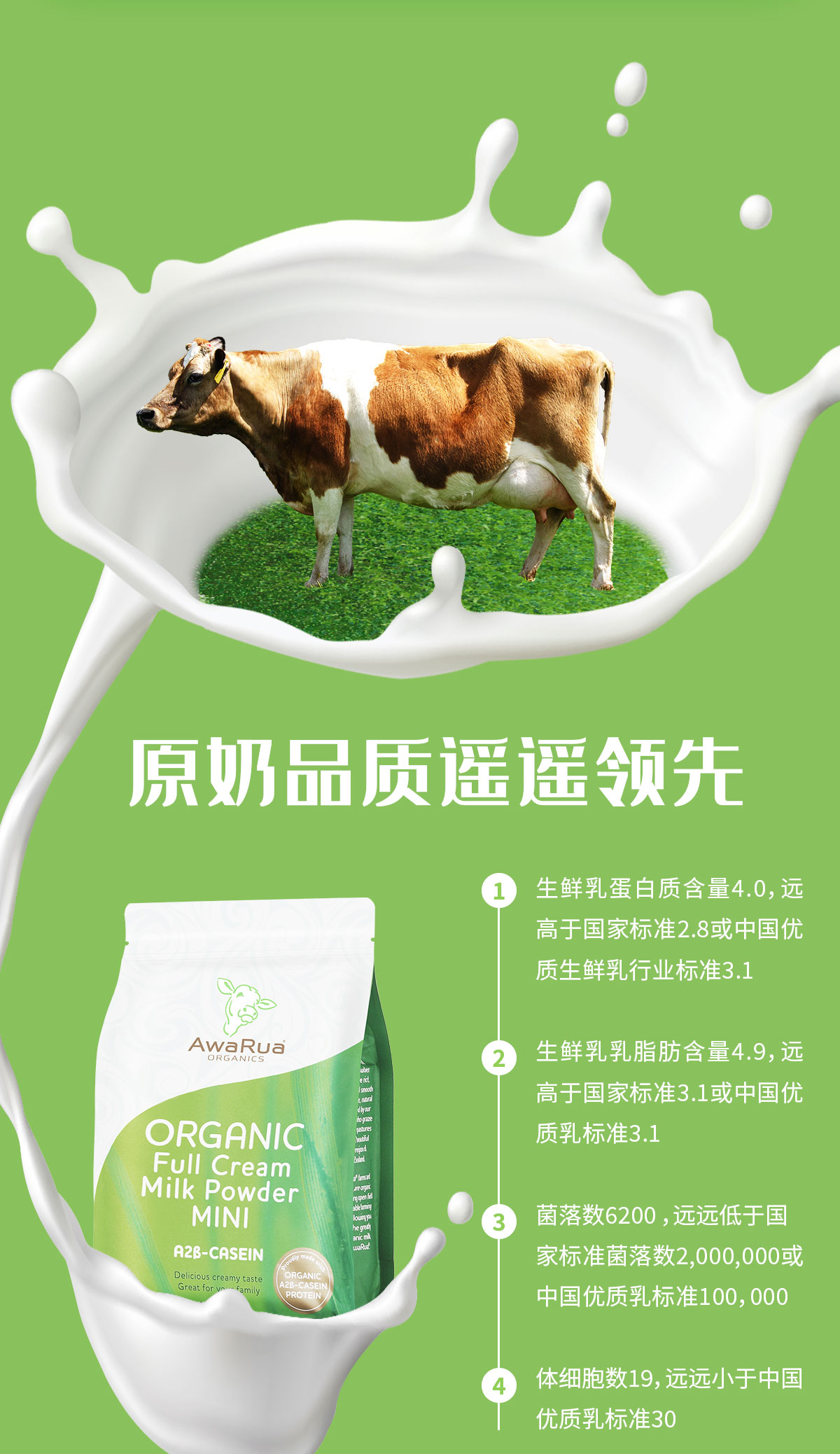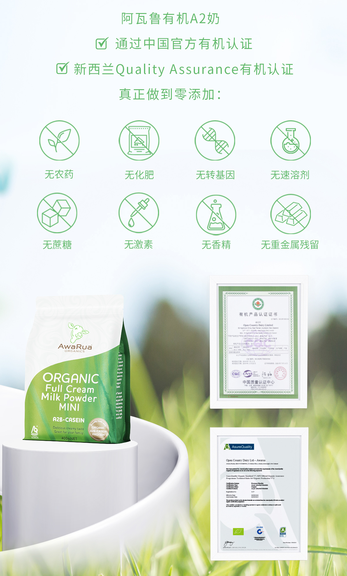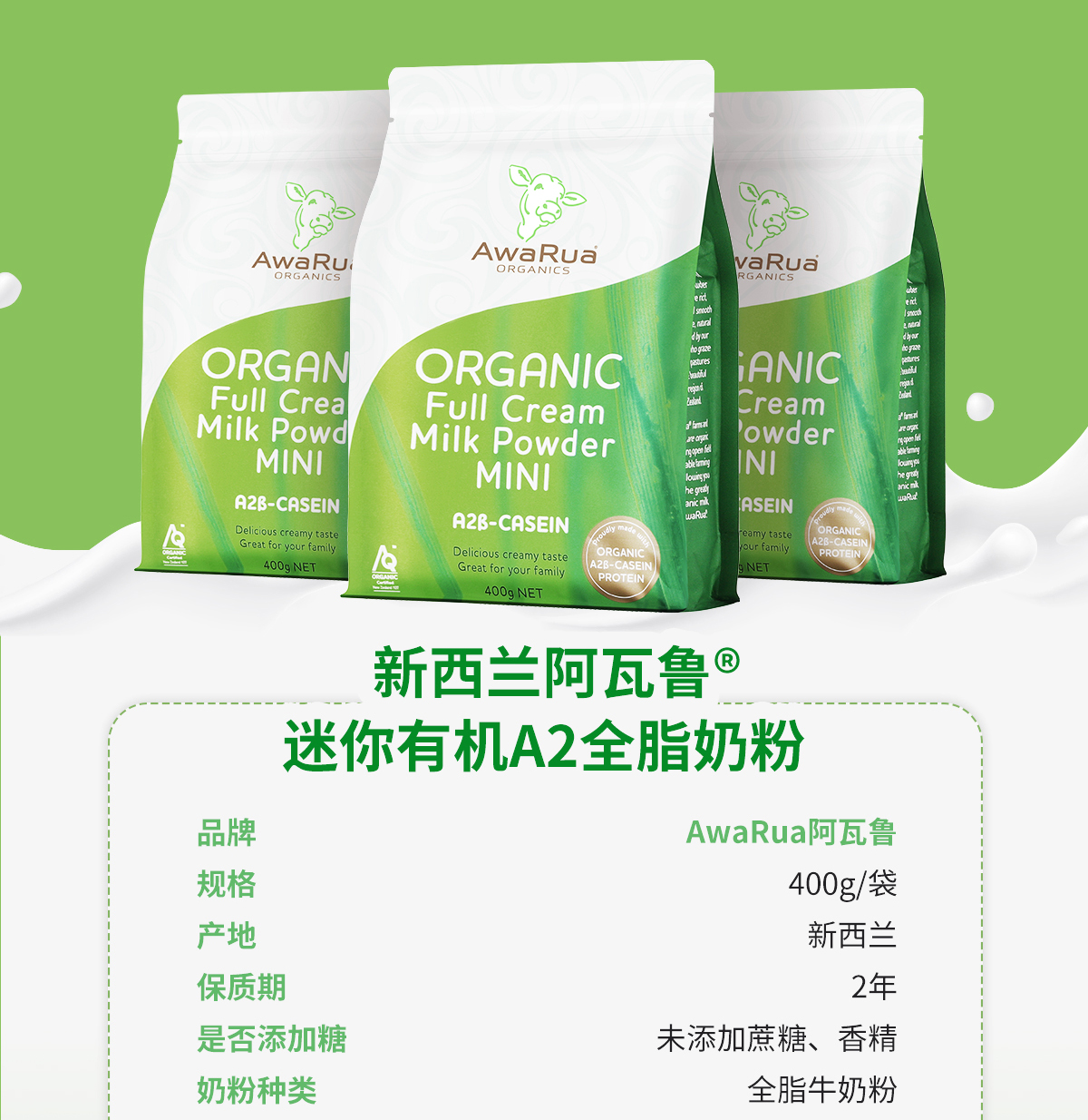 新西兰进口 阿瓦鲁A2有机全脂奶粉(袋装)800克